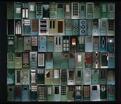 Fasciné par l’architecture, Daudelin présente une série de photographies d’éléments urbains de Montréal. Il crée des mosaïques avec des portes comme pour Courtepointe verte et Courtepointe rouge, mais aussi avec des fenêtres et des portes de garage. Dans ces deux œuvres, la grande variété des motifs, une fois juxtaposés, forme des lignes nettes rappelant l’agencement régulier de la courtepointe, cette couverture faite de variations de tissus et de motifs très populaire au Canada dès le 18e siècle. L’artiste travaille avec un choix extrêmement réduit de couleurs afin de créer un camaïeu, un décor composé d’une seule couleur avec des tons différents.