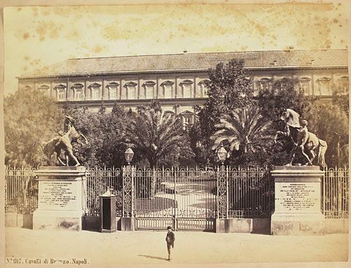 Cavaliers de bronze du sculpteur russe Pyotr Klodt devant l'entrée du palais royal, à Naples, de l'album du capitaine Frederick Stevenson