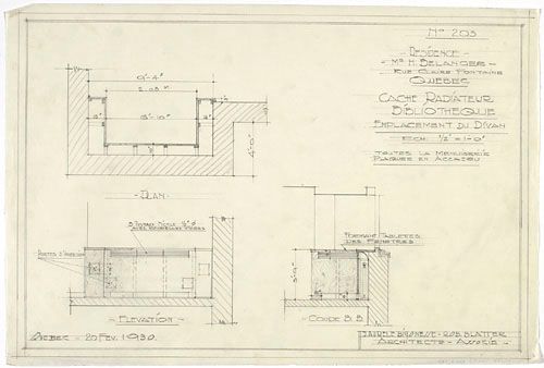 Dessin technique du cache-radiateur et de l'emplacement du divan encastré dans la bibliothèque de la maison Bélanger