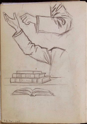 Études de livres et étude (bras et mains) pour une annonce de la Cie d'Auvents des Marchands Ltée de Montréal, de la série des « Lutins »