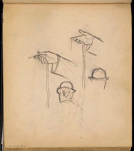 Études de mains tenant une corde et esquisses d'homme au chapeau melon