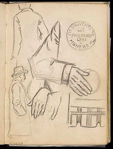 Études de personnages et études (bras, main, auvent et « logo ») pour une annonce de la Cie d'Auvents des Marchands Ltée de Montréal, de la série du « Couple »