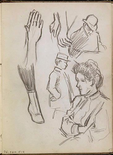 Études de personnages et études (mains en pavillon et mains sur les genoux) pour une annonce de la Cie d'Auvents des Marchands Ltée de Montréal, de la série des « Lutins »