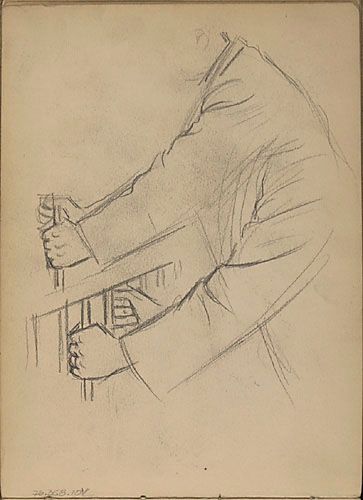 Études d'un personnage masculin tenant les barreaux d'une rampe