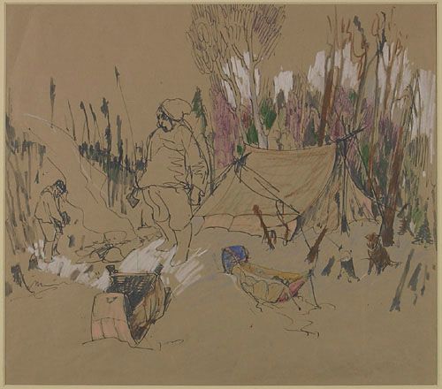Encre et crayon de couleur sur papier brun