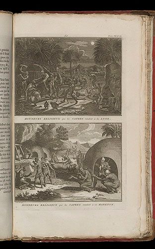 Honneurs religieux que les Cafres rendent à la lune. Honneurs religieux que les Cafres rendent à un hanneton, du livre illustré Cérémonies et coutumes religieuses de tous les peuples du monde