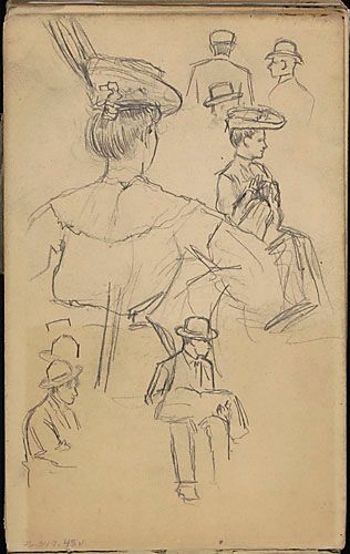 Jeune femme à l'aigrette vue de dos et études de personnages