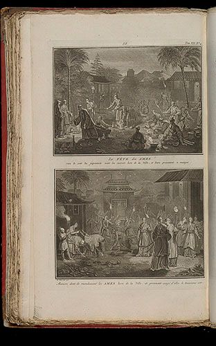La Fête des âmes. Manière dont ils reconduisent les âmes hors de la ville et prennent congé d'elles le troisième soir, du livre illustré Cérémonies et coutumes religieuses de tous les peuples du monde