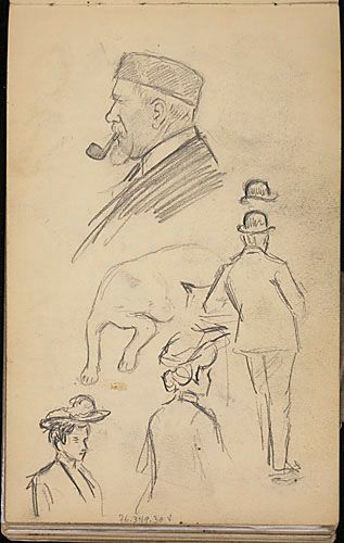 Portrait d'un homme à la pipe et études de personnages et d'un chien