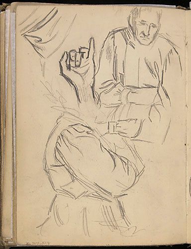 Portrait esquissé d'Adèle Bertrand, mère de l'artiste, et études (bras et main) pour une annonce de la Cie d'Auvents des Marchands Ltée de Montréal, de la série du « Couple »
