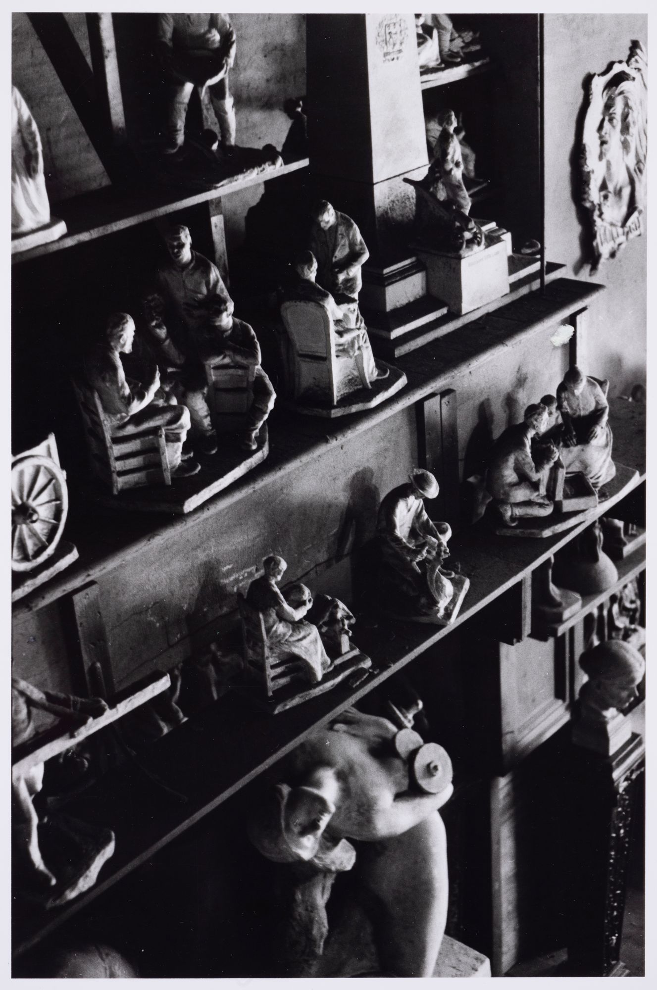 Atelier d'Alfred Laliberté. Une vue en plongée d'un mur du studio