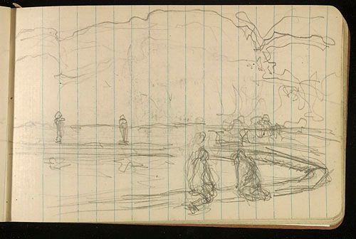 Deux Personnages assis en bordure d'un bassin d'eau