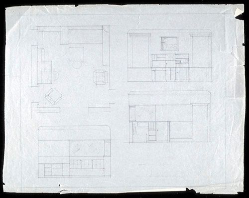 Élévations et plan au sol pour une pièce avec secrétaire et divan-bibliothèque