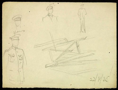 Étude d'un personnage en uniforme et d'une passerelle