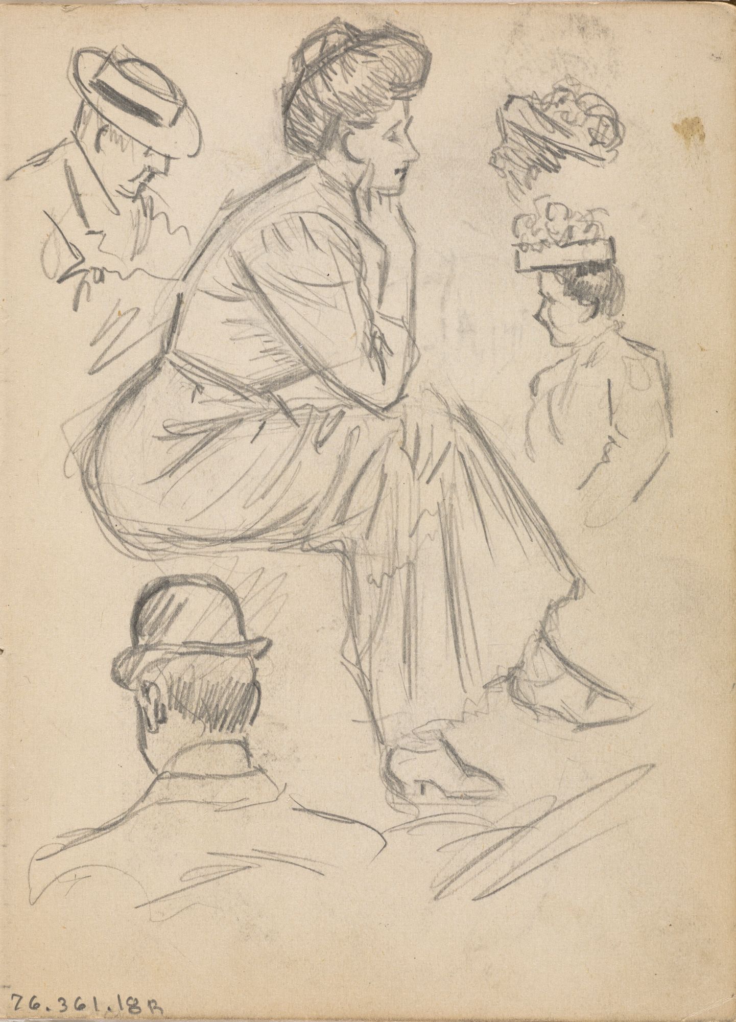 Études de personnages et étude de femme assise (Jeanne Veillette, cousine de l'artiste) pour une publicité de la Compagnie d'auvents des marchands ltée de Montréal, de la série des « Lutins »