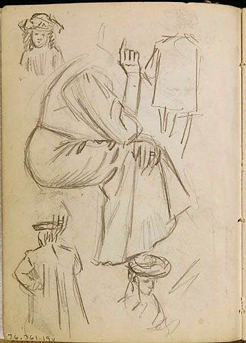 Études de personnages et étude (femme assise) pour une annonce de la Cie d'Auvents des Marchands Ltée de Montréal, de la série des « Lutins »