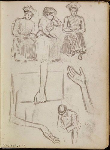 Études de personnages et études (bras et mains) pour une annonce de la Cie d'Auvents des Marchands Ltée de Montréal, de la série des « Lutins »