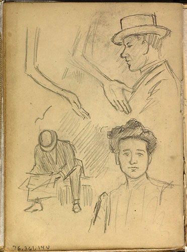 Études de personnages et études (bras et mains) pour une annonce de la Cie d'Auvents des Marchands Ltée de Montréal, de la série des « Lutins »