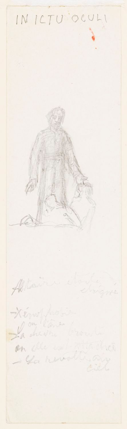 Figure d'homme en costume jésuite et inscriptions. Étude pour la décoration de l'église de Shawinigan-Sud