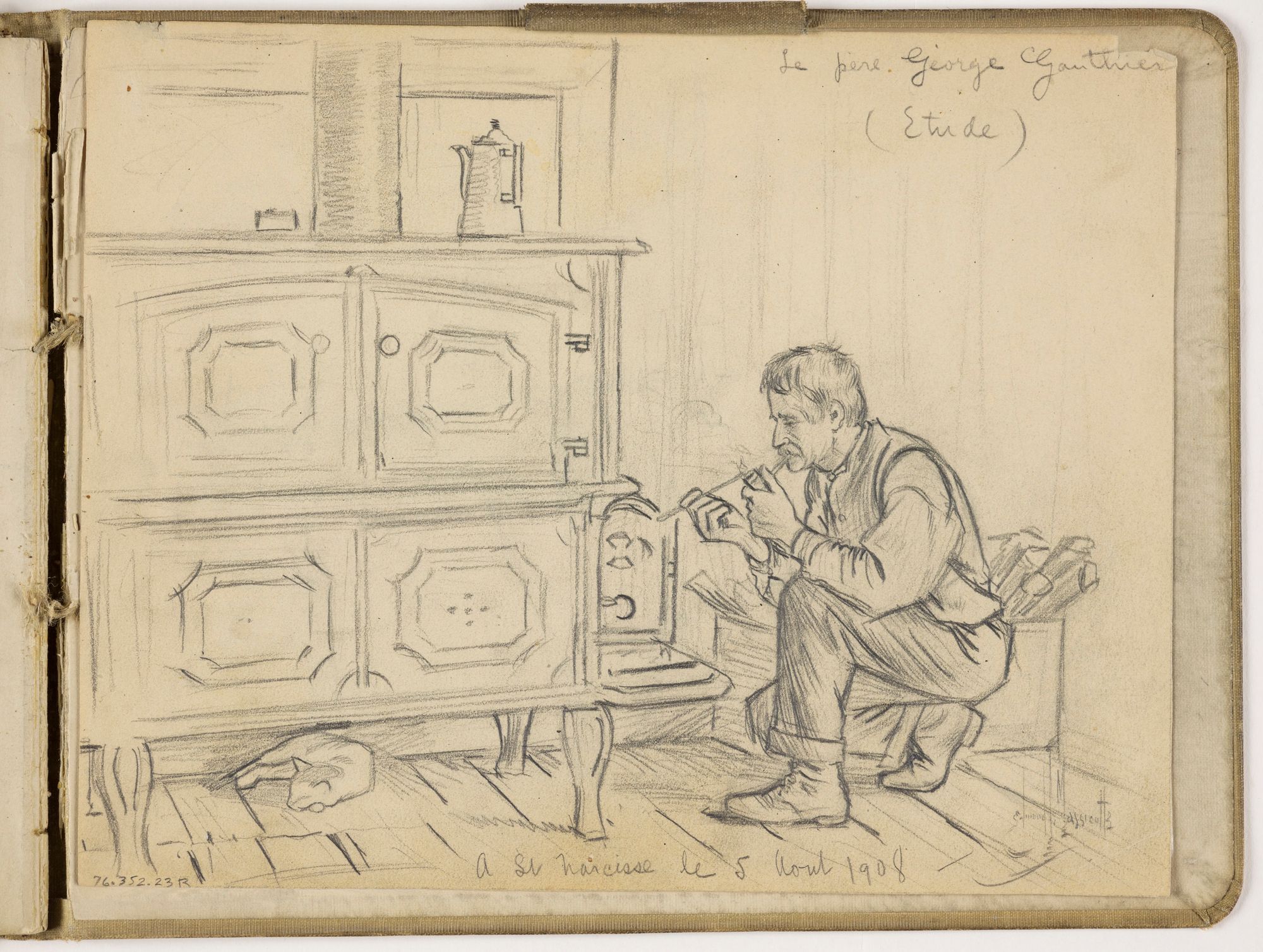 Le Père Georges Gauthier, de Saint-Narcisse, allumant sa pipe à un poêle à deux ponts