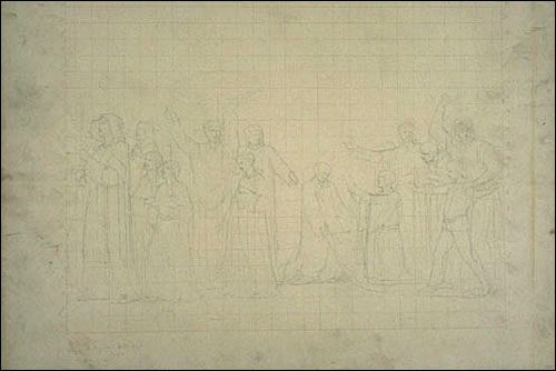 Saint Hyacinthe et ses compagnons traversant le fleuve Borysthène, à Kiev. Esquisse mise au carreau pour la décoration de la nef de la cathédrale de Saint-Hyacinthe
