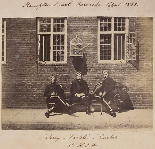 Trois officiers du 3e régiment de hussards « King's Own » posant devant la caserne du palais d'Hampton Court, Londres, Angleterre, de l'album du capitaine Frederick Stevenson